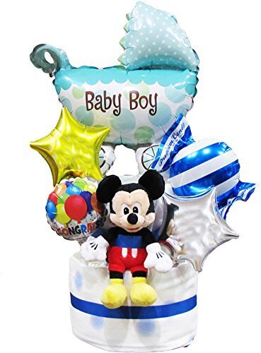 出典:images-na.ssl-images-amazon.comディズニーの人気キャラクター、ミッキー・ミニーのおむつケーキです。青系で統一されたバルーンとミッキーのぬいぐるみがデコレーションされていて、とってもかわいいですね。