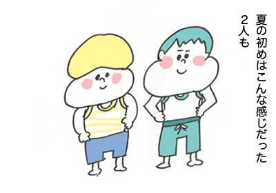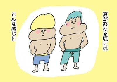 夏も終わりが見え始めて、秋の気配が近づいてきた今日この頃ですが、夏休みの連日の自宅プール&市民プール通いのためかすっかりこんがり肌に。日焼け止めを塗っても全く追いつかず。長袖のラッシュガードを着せることも考えたんだけど、コメタパン兄弟は拒否しそうで・・・。でそんなこんなで結局、いい色に焼き上がりました。パンちゃんの後ろ姿のたくましいこと。THE 男の背中!!!って感じです。この夏でまた一回り大きくなったなあ〜。としみじみ幻の白いズボンを見て思いました。そんな我が家の『この夏の衝撃エピソード』は他にも↓この記事に関連するリンクはこちらパンちゃん、公園にて叫びながらバタバタ走り回った末に・・・。コメ太が言い続ける謎の言葉の意味とは前の記事へ ▼おちょこもちのブログはこちら 絵日記ブログ VS怪獣兄弟~コメタパン絵日記~ ▼コメタパンFacebookページ ▼フォローして頂くとブログの新着記事の更新が届きます! ・掲載内容や連絡先等は、現在と異なる場合があります。・表示価格は、改正前の消費税率で掲載されている場合があります。ご了承ください。 関連記事 【コメタパン育児絵日記(99)】子どものもっともな言葉にタジタジ!! おちょこもち 【コメタパン育児絵日記(66)】かわいい女の子は誰? おちょこもち 【コメタパン育児絵日記(90)】兄弟間で弟は兄をどう呼んでいますか? おちょこもち 関連するキーワード 日焼け 夏休み コメタパン 夏 3歳 あるある 男の子 5歳 兄弟