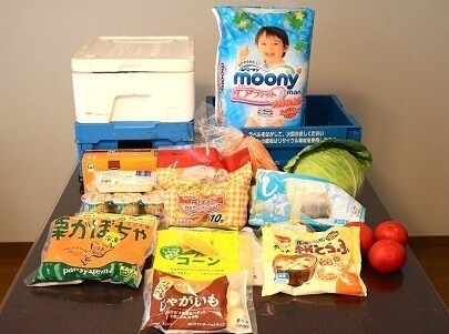 今回、松山さんが注文した商品はこちら。離乳食用の食材、おむつのほか、自分用のランチ、野菜、生活雑貨を購入しました。