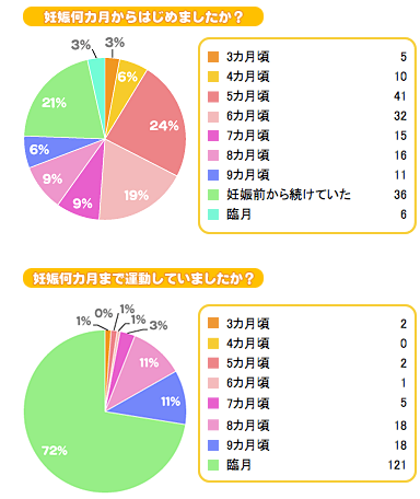 そして、いつ頃まで運動していたか?という問いには、ほとんどの方が臨月まで(72%)続けていました。妊娠中は体調が変わりやすいもの。自分の体と相談しながら、安定している時期に運動を取り入れているようですね。