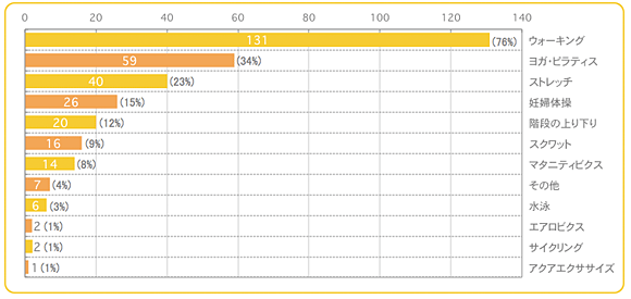 出典:www.combibaby.comおすすめの運動をお伺いしたところ、一番多かったのは「ウォーキング」(59%)でした。適度な運動になる以外にも、近所を歩いて意外な発見をしたり、季節を感じたり、いい気分転換になるようです。
