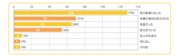 次に「体重の増加を抑えられた」(41%)が入りました。妊娠中の体重コントロールは大切ですね。食べづわりなどの場合、運動をすることで体重増加を抑えられるとうれしいですね。