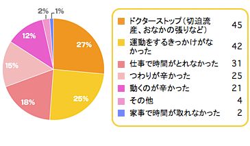 そして「仕事で時間が取れなかった」(18%)、「つわりが辛かった」(15%)、「動くのが辛かった」(12%)と続きました。