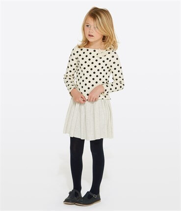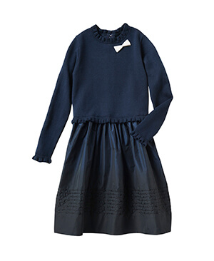 写真のワンピースは、ストレッチコットンを使用し、伸縮性に富んでいるので着心地も良く、活動的な女の子にもぴったりです。上下の切り替えデザインと首元のリボンが魅力的ですね。