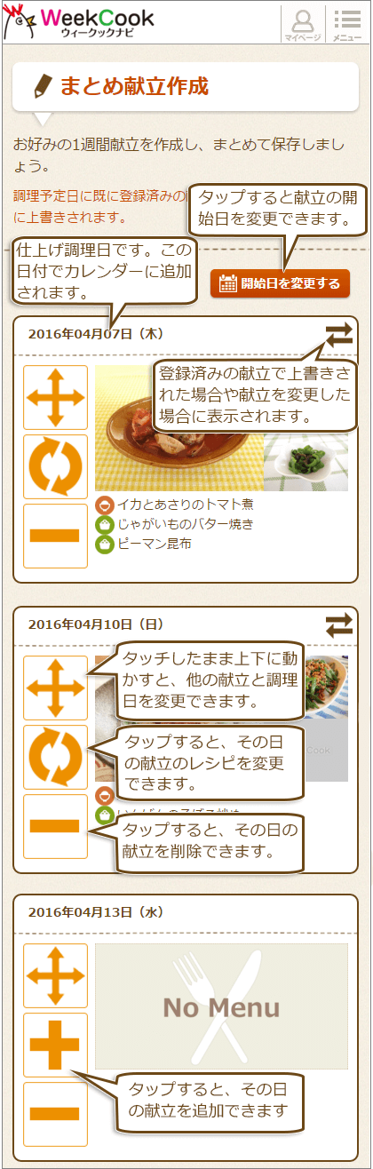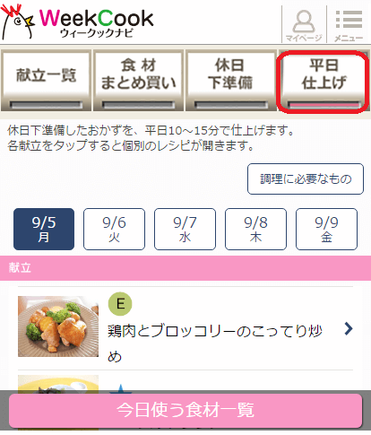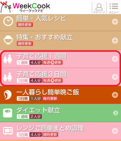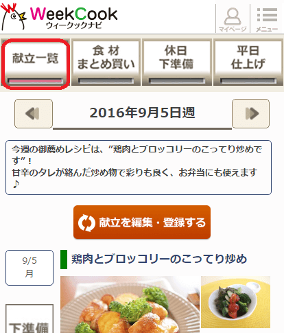 出典:www.weekcook.jp1週間分の献立を家族の好みに合わせて変えたい、という時におすすめなのが「マイ献立」です。こちらは無料の会員登録を行うと使える、献立のカスタマイズ機能です。