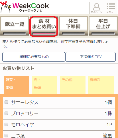 出典:www.weekcook.jp次に「食材まとめ買い」をクリックし、1週間分の食材お買いものリストを出します。