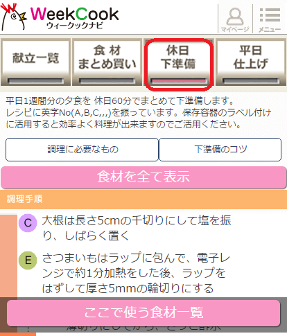 ウィークックナビを使えば、下準備はなんと60分。その秘密は、下準備の手順まで教えてくれる点です。