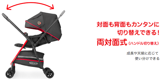 出典:www.gracobaby.jp3つ目は、赤ちゃんの顔を見ながら押せる対面式にも、ママパパと同じ景色を楽しめる背面押しにもできる、両対面式ベビーカーであること。