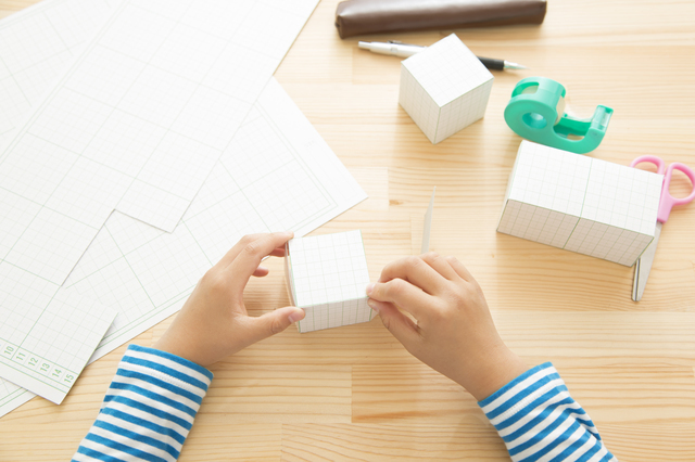 削る作業には彫刻刀やカッターナイフなどの刃物を使いますので、小さい子どもと一緒に作業する時は大人が行いましょう。削らずに組み立てて色を付けるだけでも完成します。
