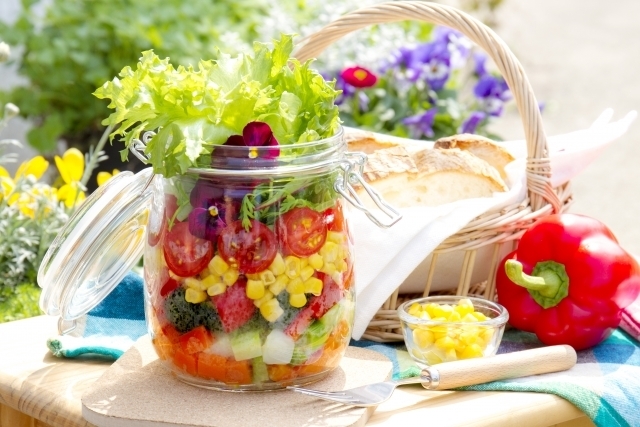 話題の「メイソンジャーサラダ」は、密封できて空気が触れずに腐りにくいので、おでかけ弁当としても人気ですよ。