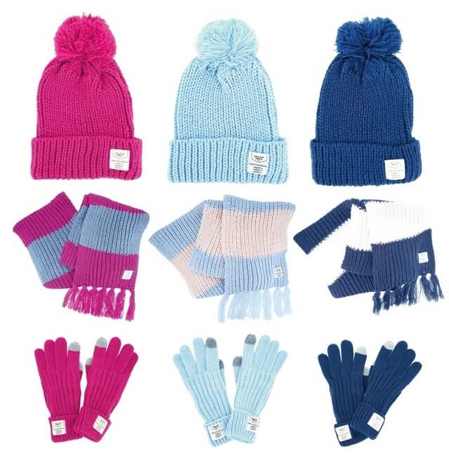 出典:special.daiso-sangyo.co.jpおそろいのポンポン付ニット帽は、ピンク、ペールブルー、ネイビーの3色。ニット帽は200円、そしてマフラーは500円、スマホの操作もできる手袋は200円。