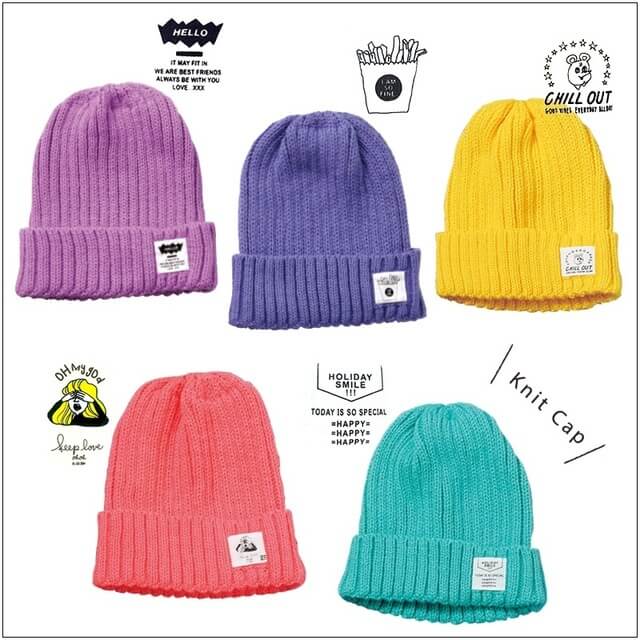 出典:special.daiso-sangyo.co.jpパープル、ブルー、イエロー、ピンク、グリーンの5色のカラーリングのニット帽です。パープルは「Hello」、ブルーは「ポテト」、イエローは「くま」、ピンクは「Oh my god」、グリーンは「HOLIDAY SMILE!!!」と、ワンポイントのマークも5色でそれぞれ違っています。