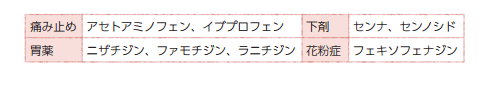 ● 多くのくすりは授乳中にのんでも赤ちゃんへの影響はほとんどありません。授乳中にのんでも問題ないくすりの成分の一部分を下表にあげました。