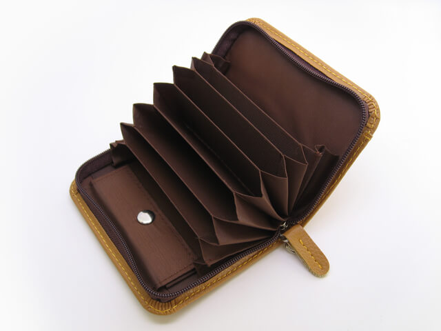内側は2つの仕切りがあり、両サイドには3つのカードケースが付いているので、診察券やカードなどをきれいに整理できますよ。大きなファスナー開閉で出し入れもしやすいです。
