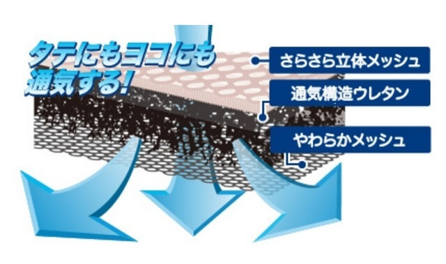 出典:www.combi.co.jp「さらすやエアスルーシート」はやわらかメッシュ・通気構造ウレタン・さらさら立体メッシュといった3層のメッシュ構造になっています。