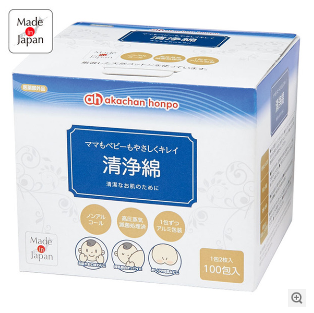 出典:akachan.omni7.jpママと赤ちゃんの肌をやさしく守ってくれる清浄綿です。肌に負担のかからない天然コットンを使っています。ノンアルコールで高圧蒸気滅菌処理済みなので、毎回安心して使うことができます。またメイドインジャパンにこだわっている商品です。