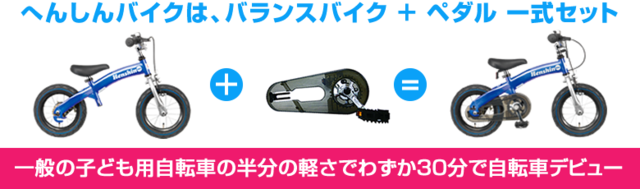出典:www.henshinbike.comわずか30分で自転車に乗れるようになってしまうという魔法のような自転車です。初めはストライダーのようにペダルなしでバランスバイクとして乗り、バランスが取れてきて5mくらい足を浮かせられるようになったら、付属のペダルをつけます。