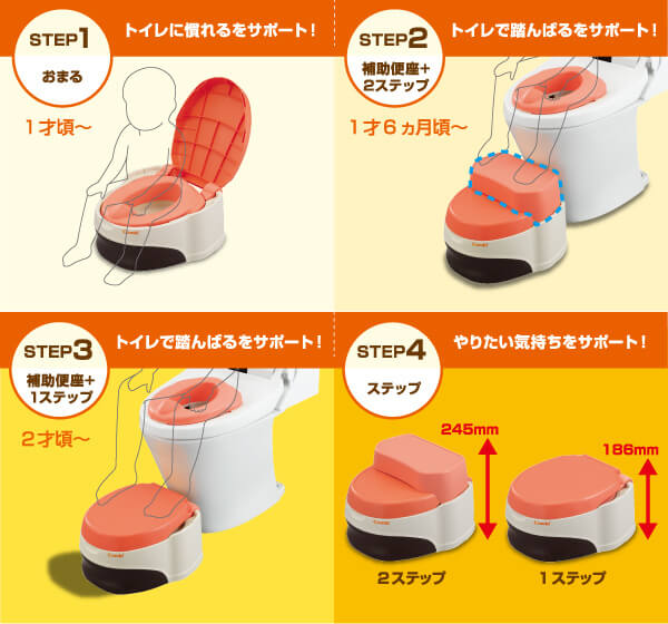 おまるで上手にできるようになったら、本当のトイレでする練習を始めましょう。補助便座とステップに分けて使い、背の高さに合わせてステップの高さを調整できます。