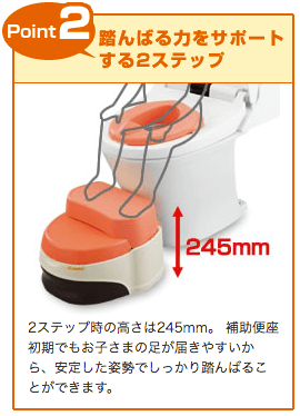 このステップは2段階に調整できるので、子どもの身長に合わせて使えます。これでトイレでの排泄時にも足をしっかりつけて安定した体勢になるので、子ども安心してできますよ。