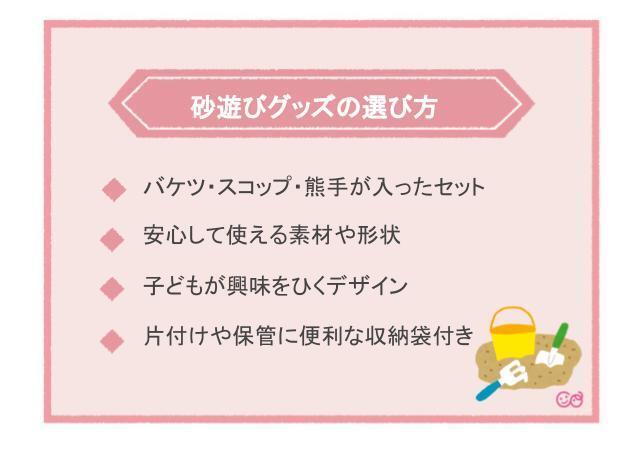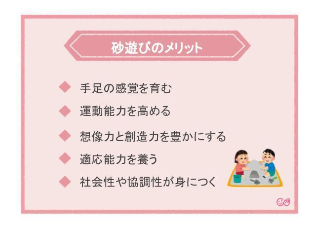 砂遊び中は、子どもが砂や道具を口に入れてしまわないように、近くにいて目を離さないようにしてあげてくださいね。