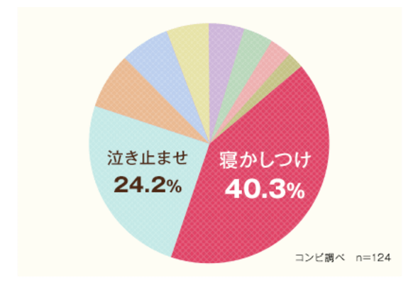 出典:www.combi.co.jpおうちの中での育児ライフの悩みのひとつは「寝かしつけ」。赤ちゃんの「泣き止ませ」よりも多く、40%以上のママたちが悩みだと回答しています。