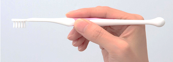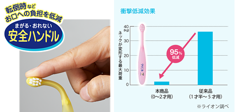 また、ハブラシは早い時期から子どもに持たせるようにしましょう。ただし、ハブラシを口の中に入れたまま歩き、転んで口の中にケガをしてしまう、という事例も多く報告されています。もしもの時のために、口への負担の少ないハブラシを使うことをおすすめします。