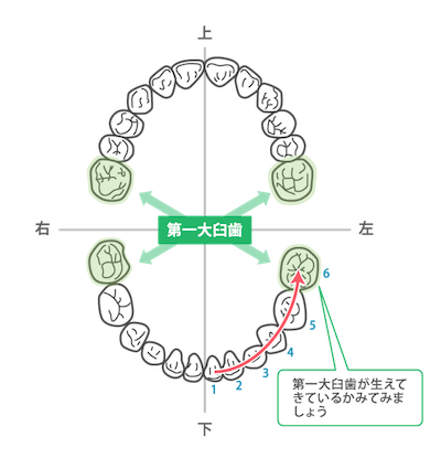 小学生になったら子どもがみがいた後、点検の目的でみがいてあげます。永久歯が正常に生えてきているかどうかも、チェックしましょう。