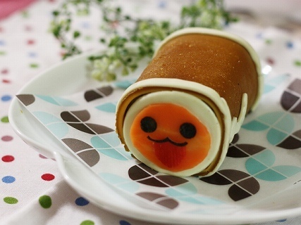 3. 余裕があれば、スライスチーズで恵方巻きのフチを巻いたり、手を付けたりすると、よりどんちゃんらしくなります。