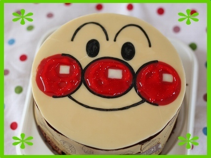 5.冷蔵庫で40~50分ほど冷やし、固まったら表返しして、赤いジェルペンもしくは苺ジャムをアンパンマンの頬と鼻に付けて出来上がりです。