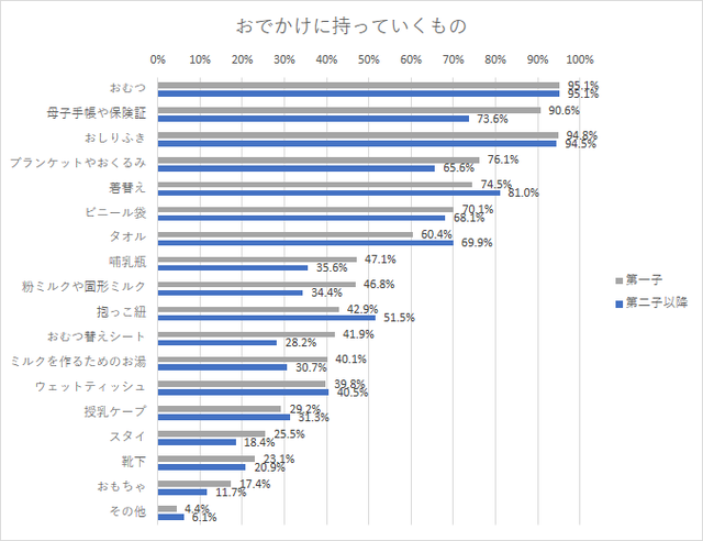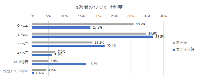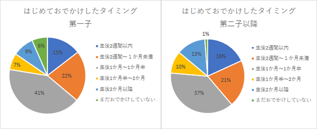 生後1ヶ月未満の場合でも、通院やお買い物等、どうしても外出しなければならない場合もよくあるようです。一人目のお子さんがいたらなおさらですね。グラフを見ていただくとわかりますが、第一子、第二子以降の場合もともに、各項目の割合と順位はほぼ同じという結果となりました。