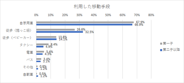 第一子、第二子以降の場合も、65%以上の方が、自家用車を使っておでかけしていました。