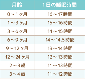 出典:www.combi.co.jp赤ちゃんに必要とされる睡眠時間/出典:「シアーズ博士夫妻のベビースリープブック」/イースト・プレス発行(共著:ドクターウィリアム・シアーズ、マーサ・シアーズ)