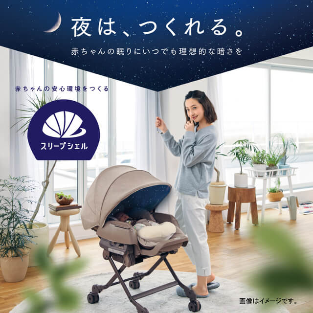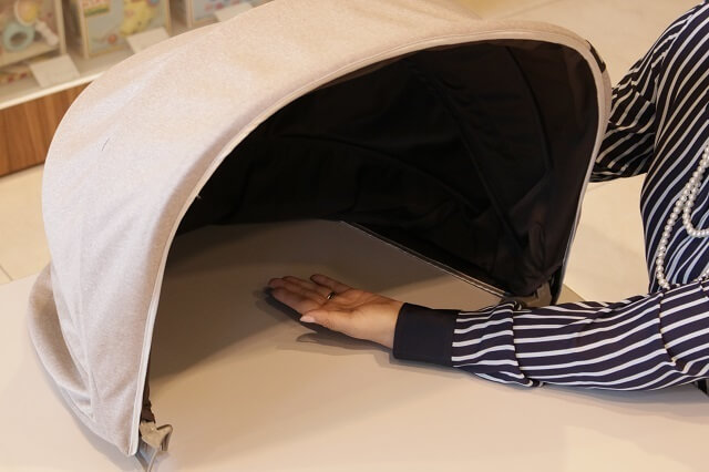 一番の特長である『スリープシェル』は遮光性の高い素材を使っている大きな幌で、いつでもどこでも理想的な暗さをつくり、赤ちゃんの目に強い光が入ることを防ぎながら、眠りやすい環境をつくれるようになっています。」(黒澤さん)