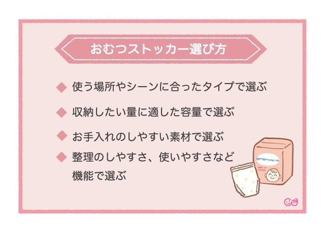おむつストッカーは、おむつやおしりふきのだけでなく、爪切りや綿棒などの細かい小物もひとまとめに収納できるのが魅力です。まとめておけば、ママ以外の人が赤ちゃんのお世話をするときにも便利ですね。