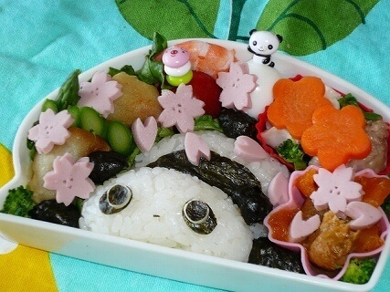 出典:ameblo.jpピンクの桜の花びら舞い散る中に白黒のパンダが映えるお弁当です。たれぱんだがダレる姿と桜のコントラストが絶妙のバランスです。