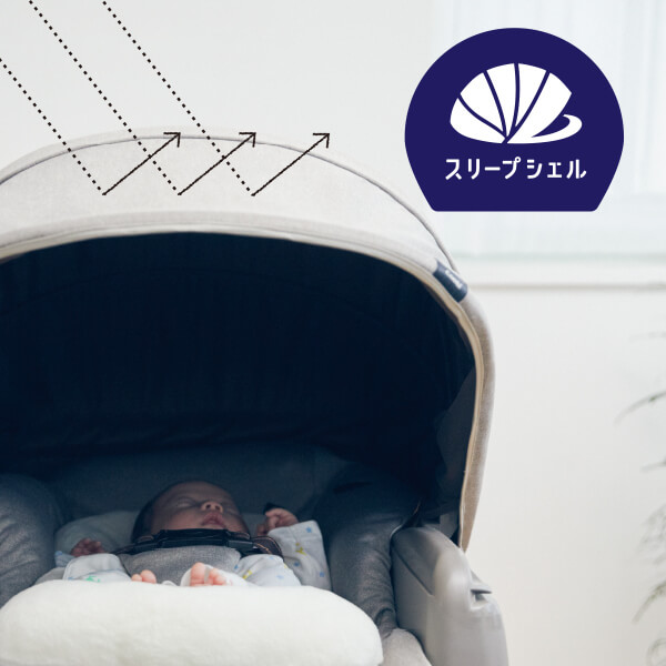 「寝かしつけに便利な揺れのリズムに加えて、新しい「ネムリラ BEDi」には、スリープシェル(おやすみドーム)がついているので、日差しや照明の光から遮り、赤ちゃんにとって理想的な夜の睡眠環境をつくってあげることができます。」