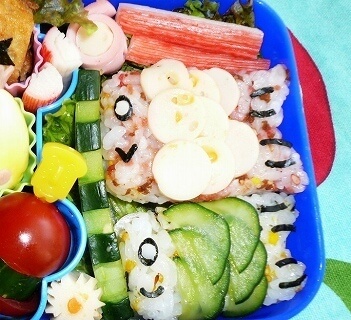 お弁当箱に、細長く切ったきゅうりを縞模様になるようカットしてポールにし、チーかまにハムを巻き付けて矢車、カニカマを並べて吹き流しにし、おにぎりに添えればぐっと鯉のぼりらしいお弁当になります。