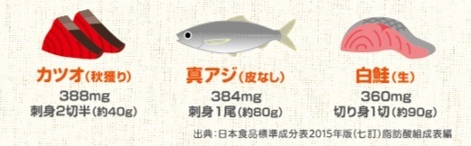 例えばカツオのお刺身2切れ半、真アジのお刺身1尾分、白鮭の切り身1切れ程度食べると、約350mgのDHAが摂れることになります。