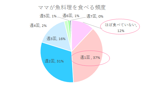 さらに、約半数のママが「魚料理は週1回以下」と答えており、魚料理の回数が多いとは言えない状況がわかってきました。