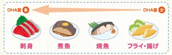 DHAは調理の仕方で含まれる量が変わり、魚は刺身で食べる場合が一番含有量が多くなりますが、食中毒の面から見ると、生で食べる場合は注意が必要です。