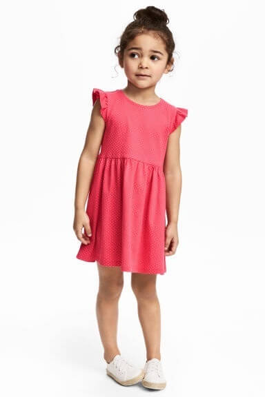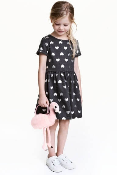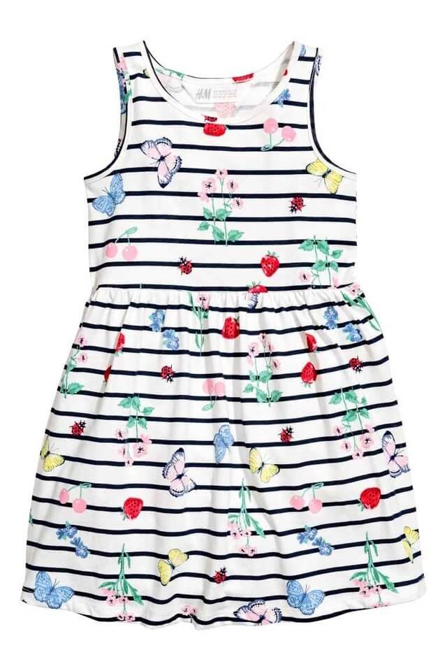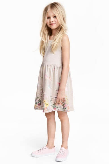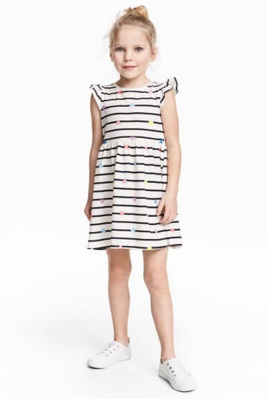 出典:www2.hm.comずぼら母の私が利用してみて便利だと思ったのが、プチプラで人気のエイチアンドエムのジャージ素材のワンピースでした。写真は「パターンジャージーワンピース」で799円。サイズは90センチ、100/105センチ、110/115センチ、120/130センチ、135/140センチがあります。