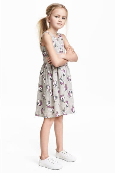 出典:www2.hm.comこちらは、ベージュにユニコーンのイラストが描かれたワンピース。印象的な柄ですが、地の色はグレーでおしゃれですね。