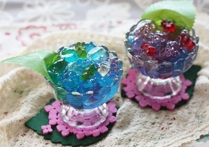 8.ブルーハワイゼリーを多くすると画像手前のような青が映える紫陽花になり、イチゴ味(紫色)を多くすると画像奥のように落ち着いた色味の紫陽花になります。