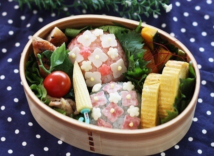 お弁当箱に入れる際は、紫陽花の葉をイメージして大葉を添えましょう。殺菌効果もある大葉は、梅雨のお弁当にもぴったりです。