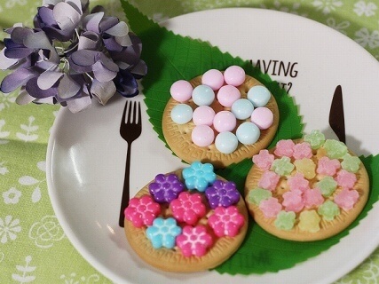 出典:ameblo.jpマリービスケットと、100均のお菓子、量り売りの菓子で彩り鮮やかな紫陽花のお菓子を作ります。