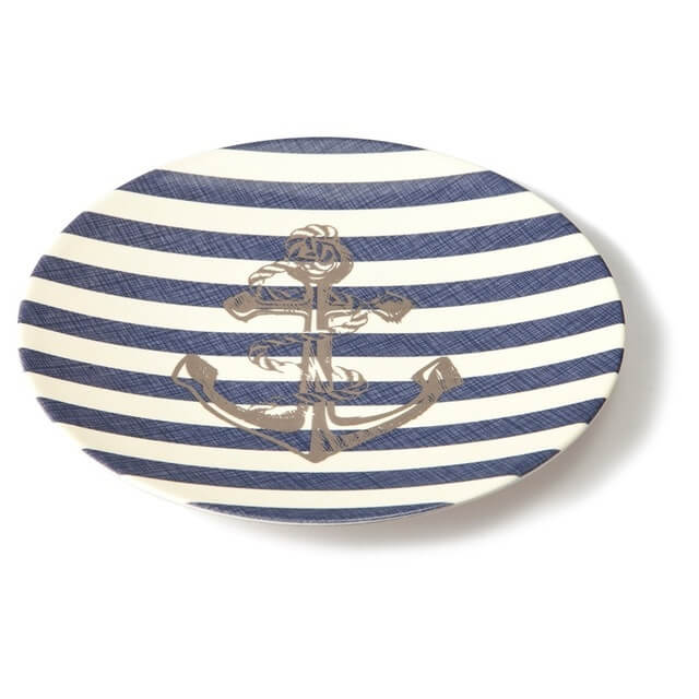 でも子連れのレジャーに持っていくお皿は「割れない」のが条件です。こちらは15センチ、イカリ柄のプレートはメラミンなので落としても割れにくい!マリンの柄で大本命です。落ち着いた色のボーダーにゴールドのイカリがとてもかわいいですね。