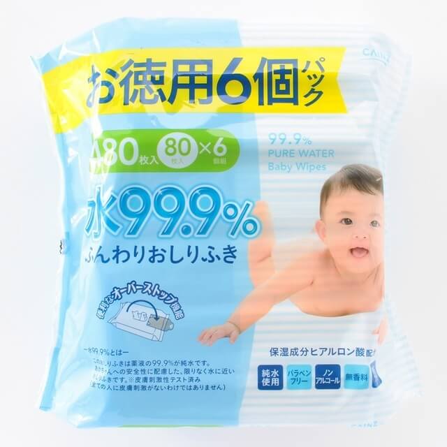 出典:www.cainz.com水99.9%、そしてヒアルロン酸配合のおしりふきです。6個パックで578円なので1個あたりは100円以下です!純水使用、パラベンフリー、ノンアルコール、無香料で製品にもこだわりを感じさせます。