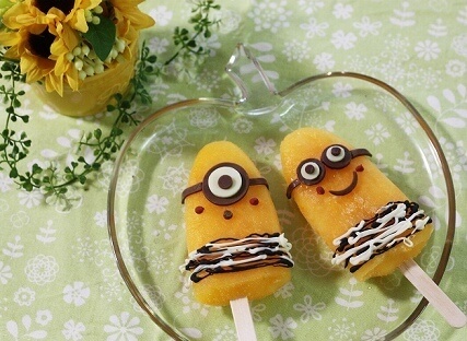 市販のみかんアイスとチョコペンで作るミニオンズ