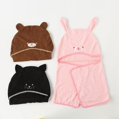 ピンク→うさぎ、黒→ねこ、茶色→くまの3種類です。購入しての感想ですが、赤ちゃんの肩くらいまでが拭ける小さめタオルなので、体をしっかり拭くなら幼児だとこれにもう1枚ほどタオルが必要かもしれません。