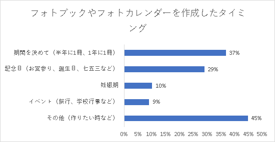 どのようなタイミングでフォトブックなどを作成したかについてもお答えいただきました。みなさん、特に決まったタイミングはなく、作りたい時などに作成していることが分かります。